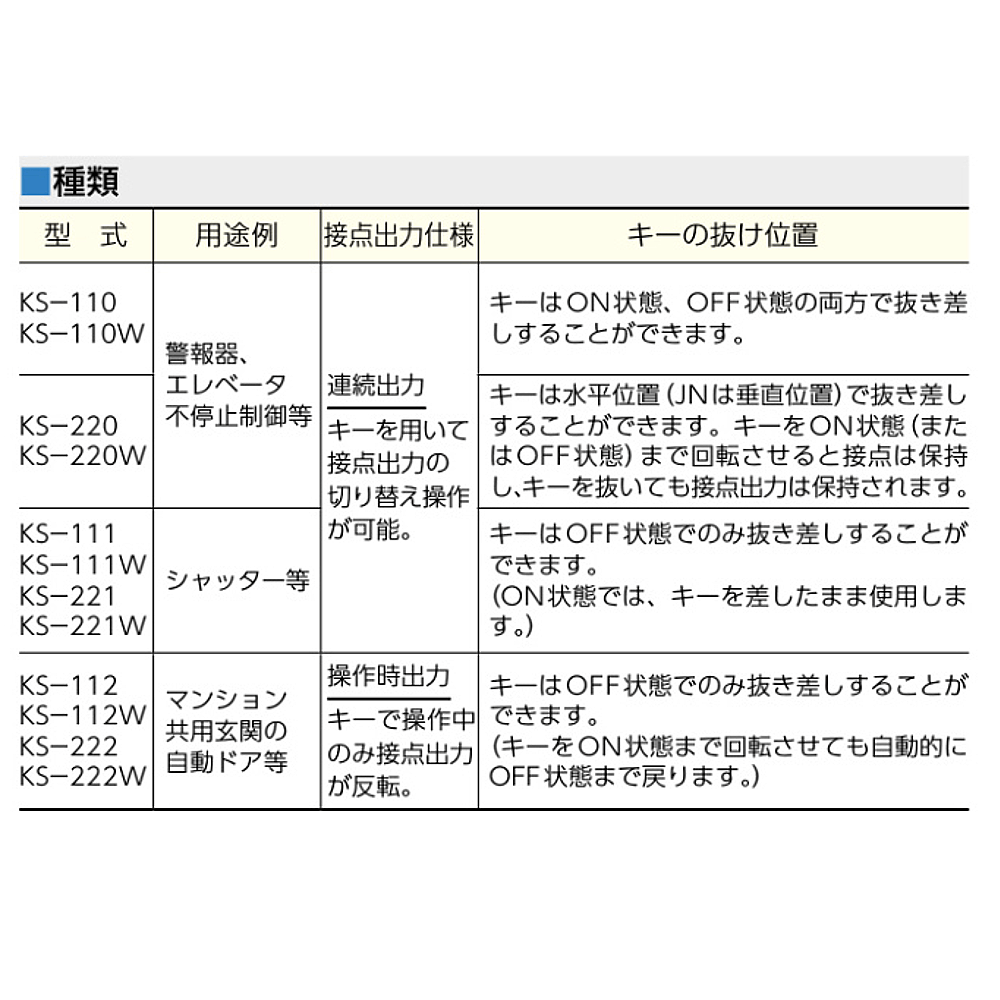 □KS-111(W):キーはOFF状態でのみ抜き差しすることができます。(ON状態ではキーを差したまま使用します)